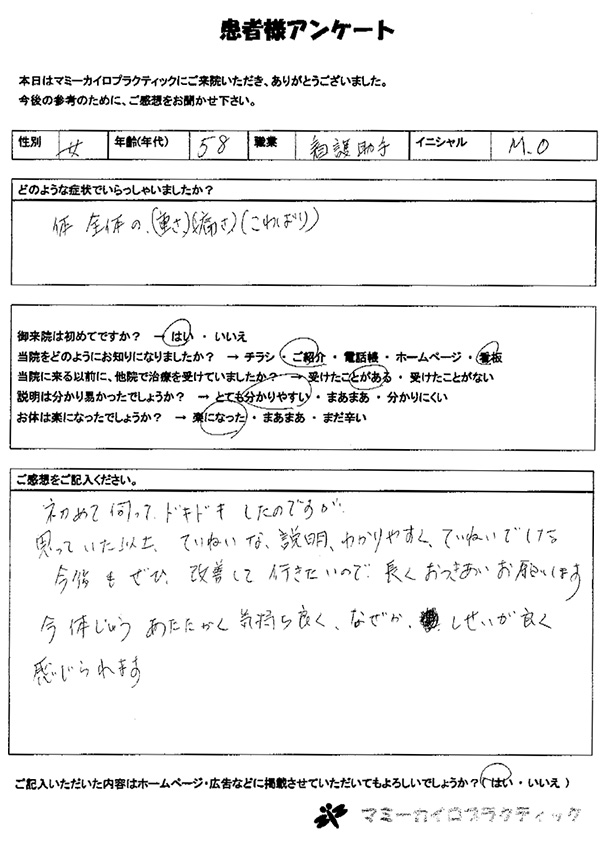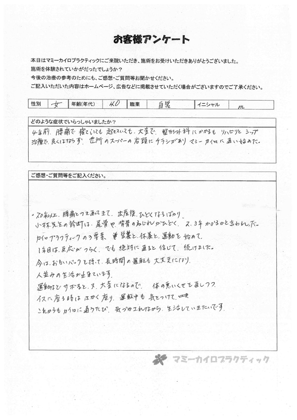 4年前、腰痛で寝ていても起きていても大変で、整形外科にかかるもリハビリとシップ治療で良くはならず、近所のスーパーの店頭にチラシがありマミーカイロに通い始めた。