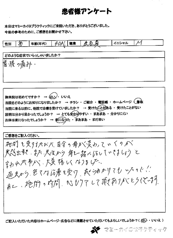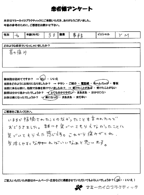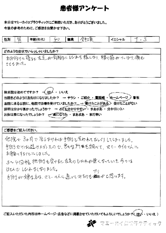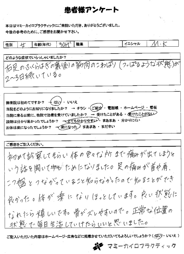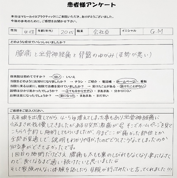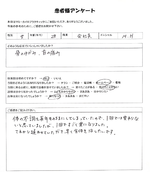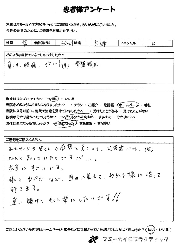どこの病院行っても治らず、ホームページでマミーカイロプラクティックを見つけました。