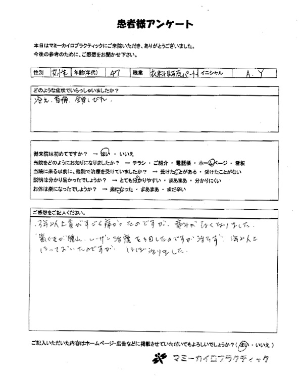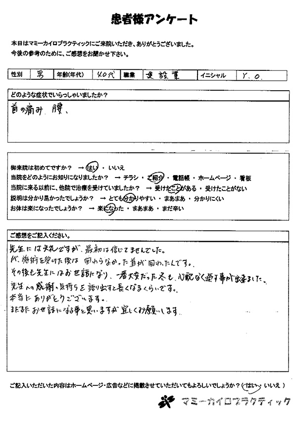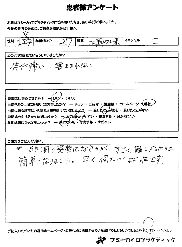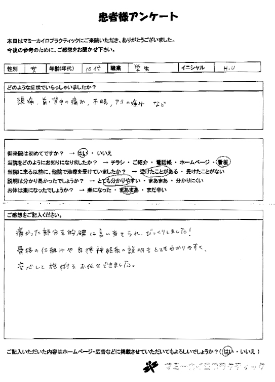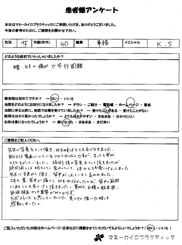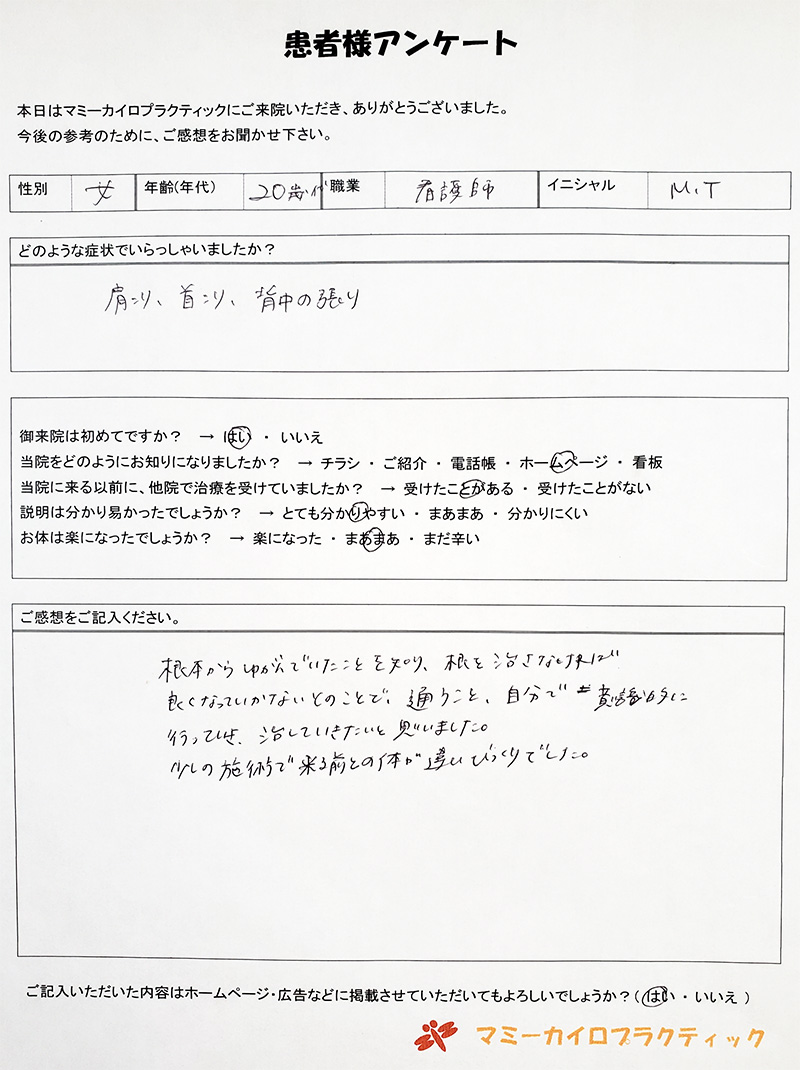 どこの病院行っても治らず、ホームページでマミーカイロプラクティックを見つけました。