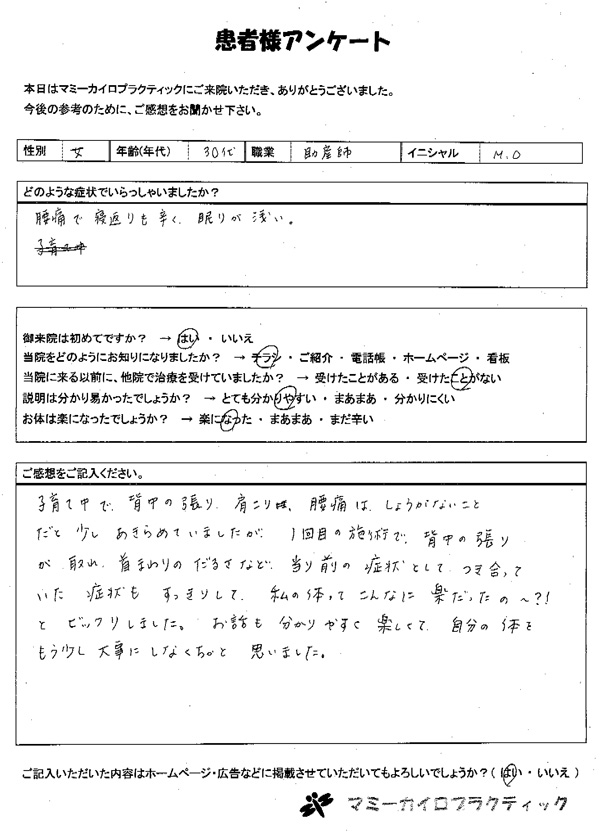 子育て中で、背中の張り、肩のこり、腰の痛みはしょうがないことだと少し諦めていましたが、1回目の施術で、背中の張りが取れ、首まわりのだるさなど、当たり前の状態としてつき合っていた状態もすっきりして、私の体ってこんなに楽だったの~?とビックリしました。