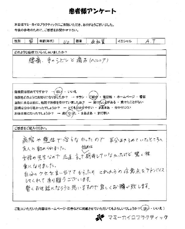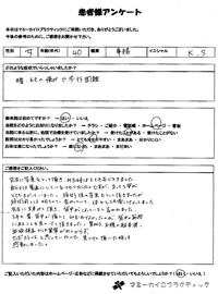 病院や整体で治らなかったので、半分あきらめていたところへ友人に勧められました。