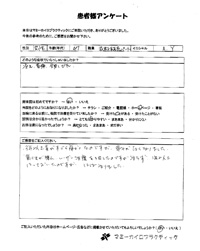 施術を受けるたびに、自分の体が変わっていくのが実感でき、また、先生から体も一緒に治していきましょうと言われた事が、大変嬉しくなりました。