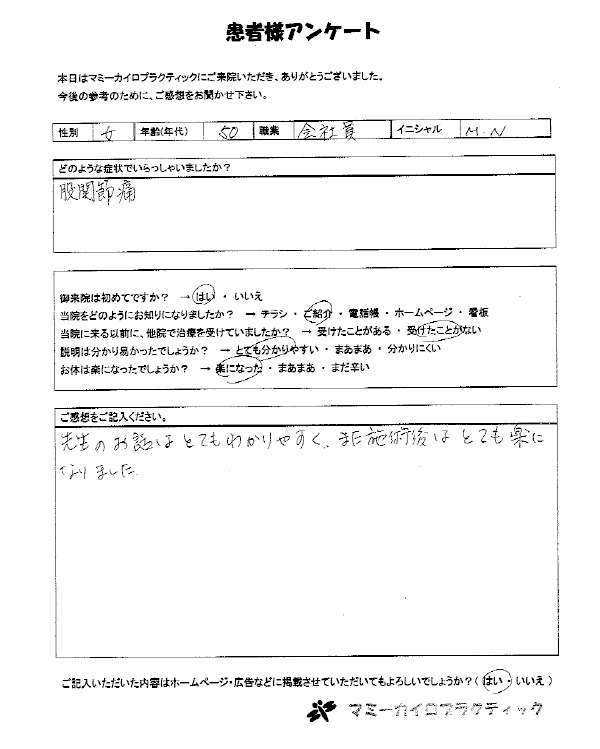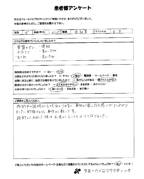 施術中の説明がとても分かりやすく、身体が楽になる感じがよくわかりました。術後はとても身体が軽いです。