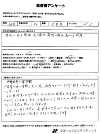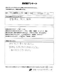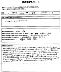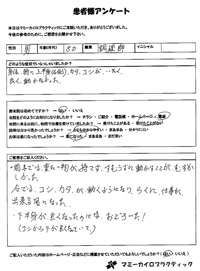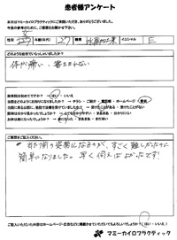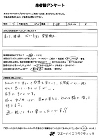 また、自分自身の意識も変わり、運動を毎日することの大事さを教わりました。自分の体はかなり時間がかかると思いますが、先生と共にがんばって治していきたいと思います。
