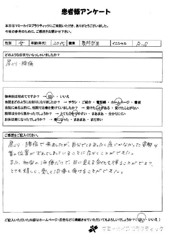 肩こり、腰痛で来ましたが、自分ではまったく気がつかなかった姿勢や首の位置がずれてしまっていることに気づくことができた。