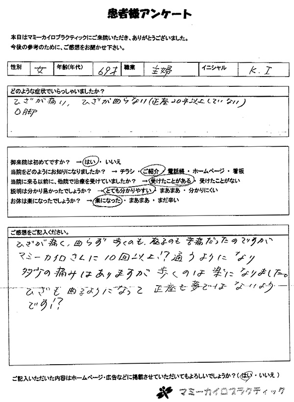 ひざが痛く、曲がらず歩くのも、座るのも苦痛だったのですがマミーカイロさんに10回以上!?通うようになり多少の痛みはありますが、歩くのは楽になりました。