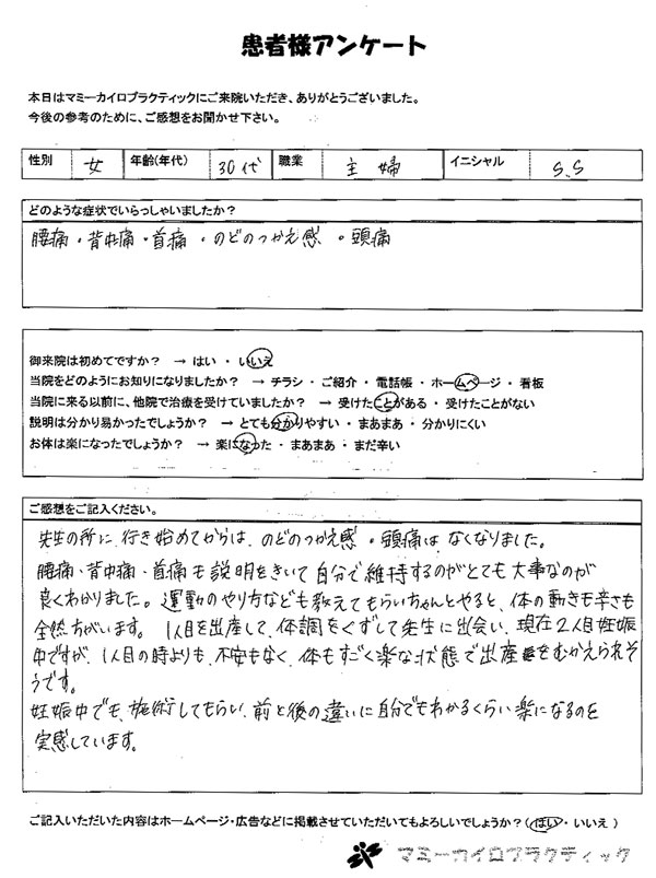 1人目を出産して、体調をくずして先生に出会い、現在2人目妊娠中ですが、1人目の時よりも、不安もなく、体もすごく楽な状態で出産をむかえられそうです。