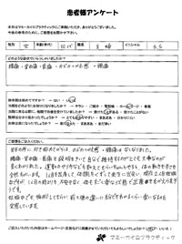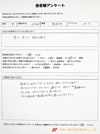 また、顎関節症であごが痛く口が開けにくかったのですが、先生に施術してもらった後、口が大きくあき、あごの痛みもなくなってきて、今までの痛みは何だったのだろうと思いました。