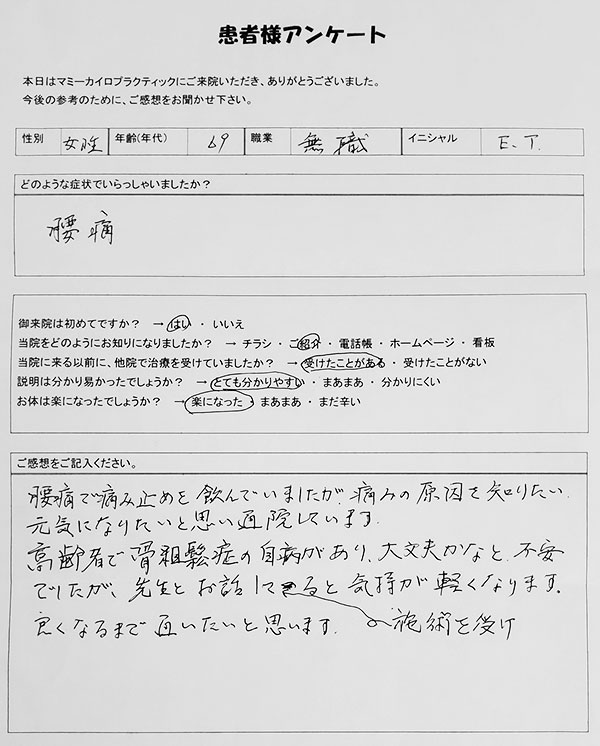 腰痛で痛み止めを飲んでいましたが、痛みの原因を知りたく、元気になりたいと思い通院しています。