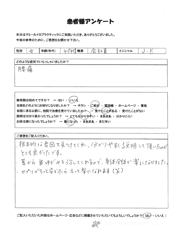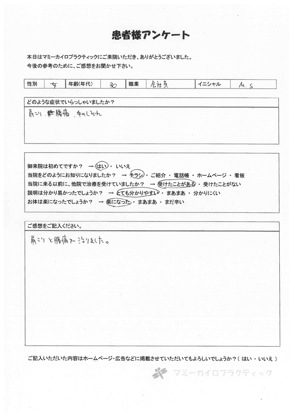 肩こり、腰痛に悩まされマッサージを受けても一時的にしか効果がなかったのですが、カイロプラクティックを受けたら1回で楽になりました。