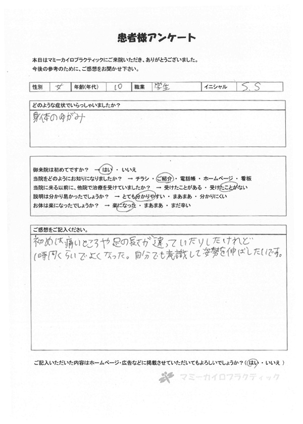 また、自分自身の意識も変わり、運動を毎日することの大事さを教わりました。自分の体はかなり時間がかかると思いますが、先生と共にがんばって治していきたいと思います。