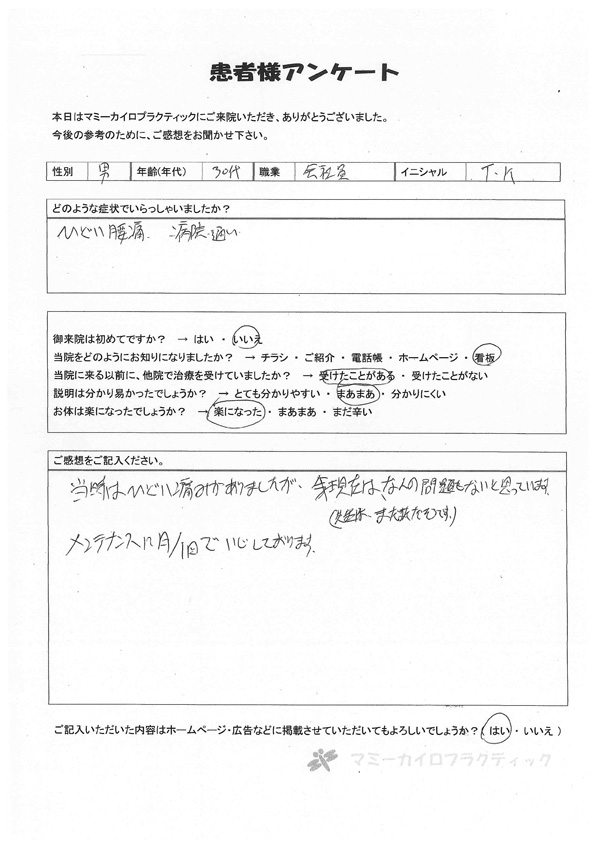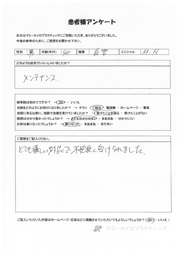 マッサージと違い効果が続くという実感があります。先生もホントに丁寧で親切です。今では私自身がカイロプラクティックに興味を持ってしまい、無料説明会に参加しようと思っています。