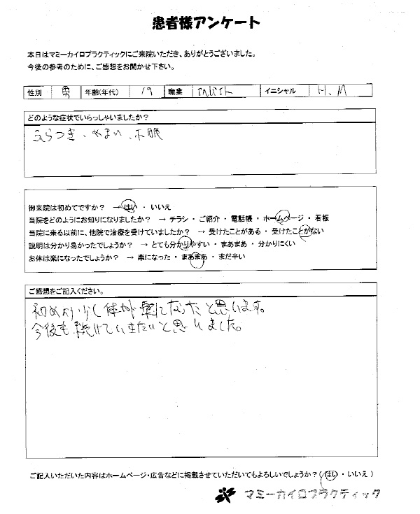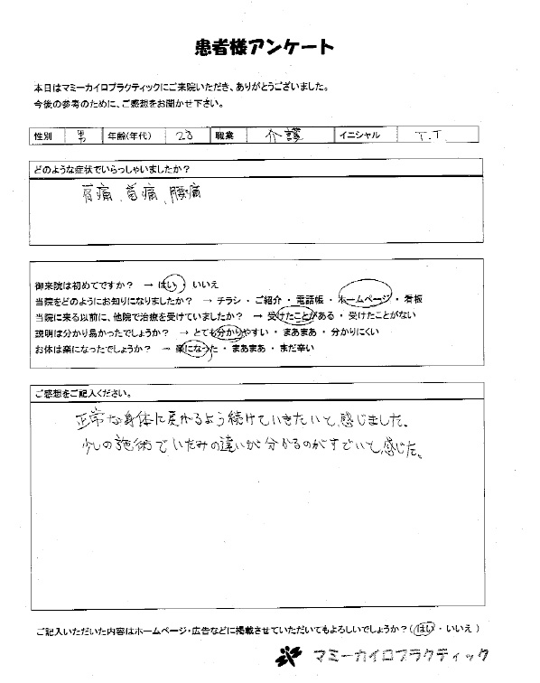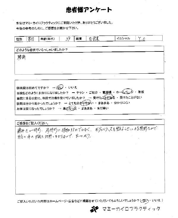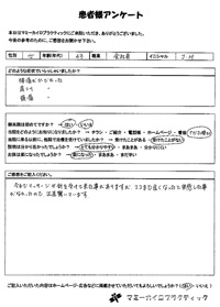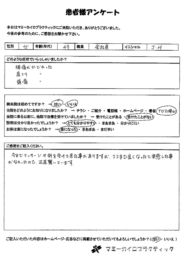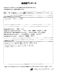 今までマッサージや針を受けて来た事がありますが、ここまで良くなったと実感した事がなかったので正直驚いています。